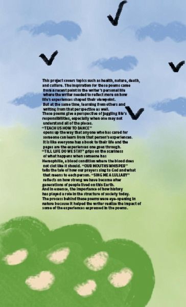 This project covers topics such as health, nature, death, and culture. The inspiration for these poems came from a recent point in the writer's personal life where the writer needed to reflect more on how life's experiences shaped their viewpoint. But at the same time, learning from others and writing from that perspective as well. These poems give a perspective of juggling life's responsibilities, especially when one may not understand all of the pieces. "TEACH US HOW TO DANCE" opens up the way that anyone who has cared for someone can learn from that person's experiences. It is like everyone has a book to their life and the pages are the experiences one goes through. "TILL LIFE DO WE STAY" grips on the scariness of what happens when someone has Hemophilia, a blood condition where the blood does not clot like it should. "OUR MOUTHS WHISPER" tells the tale of how our prayers sing to God and what that means to each person. "SING ME A LULLABY" reflects on how strong we have become after generations of people lived on this Earth. And in essence, the importance of how history has played a role in the structure of society today. The process behind these poems were eye-opening in nature because it helped the writer realize the impact of some of the experiences expressed in the poems. "7:30AM AND NOT A MINUTE MORE" discusses the impact of the deaths of the writer's maternal grandparents.
