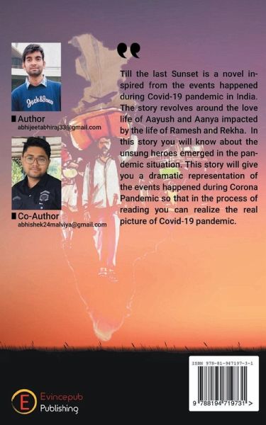 Till the last Sunset is a novel inspired by the events that happened during the Covid-19 pandemic in India. The story revolves around the love life of Aayush and Aanya impacted by the life of Ramesh and Rekha. In this story, you will know about the unsung heroes that emerged in the pandemic situation. This story will give you a dramatic representation of the events in such a way that, in the process of reading you can realize the real picture of the Covid-19 pandemic