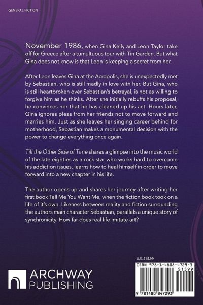 November 1986, when Gina Kelly and Leon Taylor take off for Greece after a tumultuous tour with Tin Garden. But what Gina does not know is that Leon is keeping a secret from her. After Leon leaves Gina at the Acropolis, she is unexpectedly met by Sebastian, who is still madly in love with her. But Gina, who is still heartbroken over Sebastian’s betrayal, is not as willing to forgive him as he thinks. After she initially rebuffs his proposal, he convinces her that he has cleaned up his act. Hours later, Gina ignores pleas from her friends not to move forward and marries him. Just as she leaves her singing career behind for motherhood, Sebastian makes a monumental decision with the power to change everything once again. Till the Other Side of Time shares a glimpse into the music world of the late eighties as a rock star who works hard to overcome his addiction issues, learns how to heal himself in order to move forward into a new chapter in his life. The author opens up and shares her journey after writing her first book Tell Me You Want Me, when the fiction book took on a life of it’s own. Likeness between reality and fiction surrounding the authors main character Sebastian, parallels a unique story of synchronicity. How far does real life imitate art?