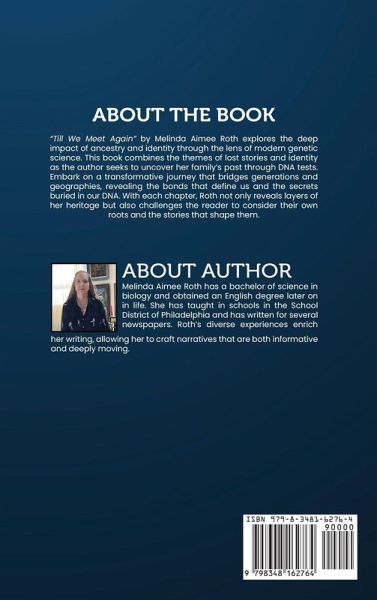 ABOUT THE BOOK "Till We Meet Again" by Melinda Aimee Roth explores the deep impact of ancestry and identity through the lens of modern genetic science. This book combines the themes of lost stories and identity as the author seeks to uncover her family's past through DNA tests. Embark on a transformative journey that bridges generations and geographies, revealing the bonds that define us and the secrets buried in our DNA. With each chapter, Roth not only reveals layers of her heritage but also challenges the reader to consider their own roots and the stories that shape them. ABOUT AUTHOR Melinda Aimee Roth has a bachelor of science in biology and obtained an English degree later on in life. She has taught in schools in the School District of Philadelphia and has written for several newspapers. Roth's diverse experiences enrich her writing, allowing her to craft narratives that are both informative and deeply moving.