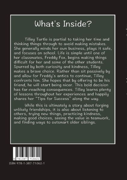 Title: Tilley's Tips for Success: A Turtle's Tale On Forging Friendship Author/Illustrator: Heather E. Williams First Print Edition ISBN 978-1-387-71062-1 Tilley Turtle is partial to taking her time and thinking things through to avoid making mistakes. She generally minds her own business, plays it safe, and focuses on school. Life is simple until one of her classmates, Freddy Fox, begins making things difficult for her and some of the other students. Spurred by both curiosity and kindness, Tilley makes a brave choice. Rather than sit passively by and allow for Freddy's antics to continue, Tilley confronts him. She hopes that by offering to be his friend, he will start being nicer. This bold decision has far-reaching consequences. Tilley learns plenty of lessons throughout her experiences and happily shares her "Tips for Success" along the way. While this is ultimately a story about forging unlikely friendships, it is also about listening to others, trying new things, practicing kindness, making good choices, seeing the value in teamwork, and finding ways to outsmart older siblings.