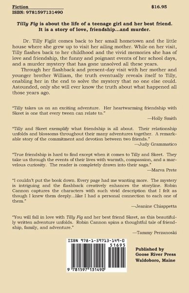 Tilly Fig is about the life of a teenage girl and her best friend. It is a story of love, friendship...and murder. Dr. Tilly Figlit comes back to her small hometown and the little house where she grew up to visit her ailing mother. While on her visit, Tilly flashes back to her childhood and the vivid memories she has of love and friendship, the funny and poignant events of her school days, and a murder mystery that has gone unsolved all these years. Through her flashback and present-day visit with her mother and younger brother William, the truth eventually reveals itself to Tilly, enabling her in the end to solve the mystery that no one else could. Astounded, only she will ever know the truth about what happened all those years ago. "Tilly takes us on an exciting adventure. Her heartwarming friendship with Skeet is one that every tween can relate to." -Holly Smith "Tilly and Skeet exemplify what friendship is all about. Their relationship unfolds and blossoms throughout their many adventures together. A remarkable story of the commitment and devotion between two friends." -Judy Grammatico "True friendship is hard to find except when it comes to Tilly and Skeet. They take us through the events of their lives with warmth, compassion, and a marvelous curiosity. The reader is completely drawn into their saga." -Marva Prete "I couldn't put the book down. Every page had me wanting more. The mystery is intriguing and the flashback creatively enhances the storyline. Robin Cannon captures the characters with such vivid description that I felt as though I knew them deeply...like I had a personal connection to each one of them." -Jeanine Chiappetta "You will fall in love with Tilly Fig and her best friend Skeet, as this beautifully written adventure unfolds. Robin Cannon spins a thoughtful tale of friendship, family, and adventure." -Tammy Perzanoski