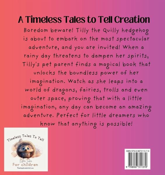 Boredom beware! Tilly the Quilly hedgehog is about to embark on the most spectacular adventure, and you are invited! When a rainy day threatens to dampen her spirits, Tilly's pet parent finds a magical book that unlocks the boundless power of her imagination. Watch as she leaps into a world of dragons, fairies, trolls and even outer space, proving that with a little imagination, any day can become an amazing adventure. Perfect for little dreamers who know that anything is possible!