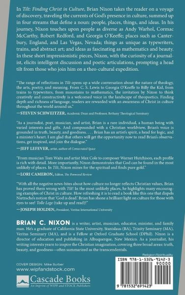 In Tilt: Finding Christ in Culture, Brian Nixon takes the reader on a voyage of discovery, traveling the currents of God's presence in culture, summed up in four streams that define a noun: people, places, things, and ideas. In his journey, Nixon touches upon people as diverse as Andy Warhol, Cormac McCarthy, Robert Redford, and Georgia O'Keeffe; places such as Canterbury, England, and Las Vegas, Nevada; things as unique as typewriters, trains, and abstract art; and ideas as fascinating as mathematics and beauty. In these short impressionistic pieces, Nixon, with the curiosity of a journalist, elicits intelligent discussion and poetic articulations, prompting a head tilt from those who join him on a theo-cultural expedition.