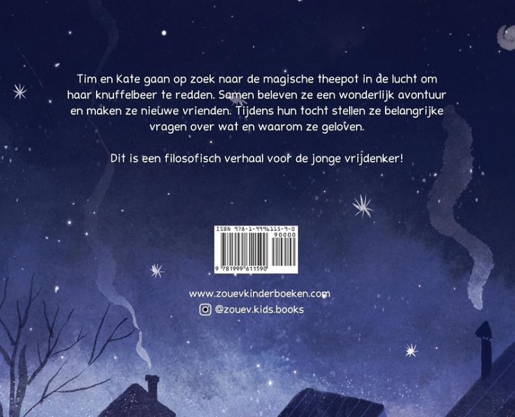 Tim en Kate gaan op zoek naar de grote theepot in de lucht om haar knuffelbeer te redden. Tijdens hun tocht stellen ze belangrijke vragen over wat en waarom ze geloven. Dit is een filosofisch verhaal voor de jonge vrijdenker!