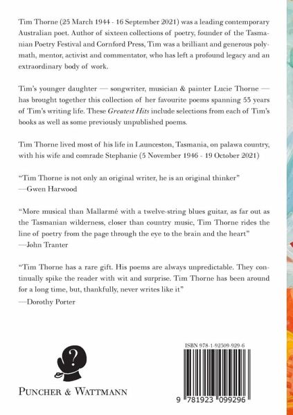 Tim Thorne (25 March 1944 - 16 September 2021) was a leading contemporary Australian poet. Author of sixteen collections of poetry, founder of the Tasmanian Poetry Festival and Cornford Press, Tim was a brilliant and generous polymath, mentor, activist and commentator, who has left a profound legacy and an extraordinary body of work. Tim's younger daughter - songwriter, musician & painter Lucie Thorne - has brought together this collection of her favourite poems spanning 53 years of Tim's writing life. These Greatest Hits include selections from each of Tim's books as well as some previously unpublished poems. Tim Thorne lived most of his life in Launceston, Tasmania, on palawa country, with his wife and Comrade Stephanie (5 November 1946 - 19 October 2021)