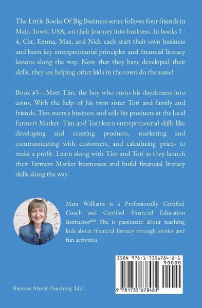The Little Books Of Big Business series follows four friends in Main Town, USA, on their journey into business. In books 1 - 4, Cat, Emma, Max, and Nick each start their own business and learn key entrepreneurial principles and financial literacy lessons along the way. Now that they have developed their skills, they are helping other kids in the town do the same! Book #5-Meet Tim, the boy who turns his daydreams into coins. With the help of his twin sister Tori and family and friends, Tim starts a business and sells his products at the local Farmers Market. Tim and Tori learn entrepreneurial skills like developing and creating products, marketing and communicating with customers, and calculating prices to make a profit. Learn along with Tim and Tori as they launch their Farmers Market businesses and build financial literacy skills along the way.