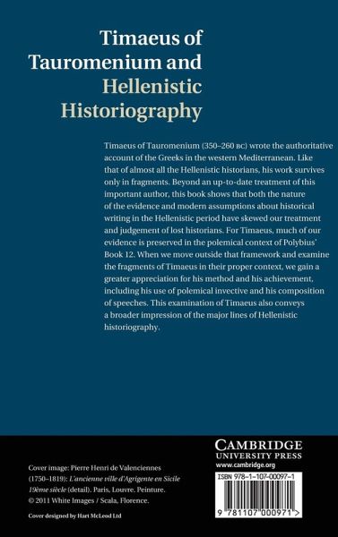 Timaeus of Tauromenium (350-260 BC) wrote the authoritative work on the Greeks in the Western Mediterranean and was important through his research into chronology and his influence on Roman historiography. Like almost all the Hellenistic historians, however, his work survives only in fragments. This book provides an up-to-date study of his work and shows that both the nature of the evidence and modern assumptions about historical writing in the Hellenistic period have skewed our treatment and judgement of lost historians. For Timaeus, much of our evidence is preserved in the polemical context of Polybius' Book 12. When we move outside that framework and examine the fragments of Timaeus in their proper context, we gain a greater appreciation for his method and his achievement, including his use of polemical invective and his composition of speeches. This has important implications for our broader understanding of the major lines of Hellenistic historiography.