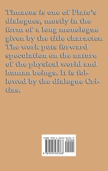 Timaeus is one of Plato's dialogues, mostly in the form of a long monologue given by the title character. The work puts forward speculation on the nature of the physical world and human beings. It is followed by the dialogue Critias.
