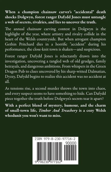 When a champion chainsaw carver's "accidental" death shocks Dolgwyn, forest ranger Dafydd Jones must untangle a web of secrets, rivalries, and lies to uncover the truth. The annual chainsaw carving contest in Dolgwyn is the highlight of the year, where artistry and rivalry collide in the heart of the Welsh countryside. But when arrogant champion Gethin Pritchard dies in a horrific "accident" during his performance, the close-knit town is shaken-and suspicious. Forest ranger Dafydd Jones is reluctantly drawn into the investigation, uncovering a tangled web of old grudges, family betrayals, and dangerous ambitions. From whispers in the Green Dragon Pub to clues uncovered by his sharp-witted Dalmatian, Dyzzy, Dafydd begins to realize this accident was no accident at all. As tensions rise, a second murder throws the town into chaos, and every suspect seems to have something to hide. Can Dafydd piece together the truth before Dolgwyn's secrets tear it apart? With a perfect blend of mystery, humour, and the charm of small-town life, Timber And Treachery is a cozy Welsh whodunit you won't want to miss.