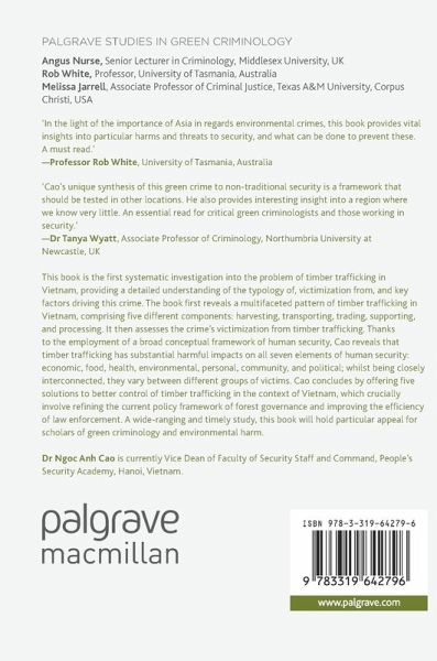 This book is the first systematic investigation into the problem of timber trafficking in Vietnam, providing a detailed understanding of the typology of, victimization from, and key factors driving this crime. The book first reveals a multifaceted pattern of timber trafficking in Vietnam, comprising five different components: harvesting, transporting, trading, supporting, and processing. It then assesses the crime's victimization from timber trafficking. Thanks to the employment of a broad conceptual framework of human security, Cao reveals that timber trafficking has substantial harmful impacts on all seven elements of human security: economic, food, health, environmental, personal, community, and political; whilst being closely interconnected, they vary between different groups of victims. Cao concludes by offering five solutions to better control of timber trafficking in the context of Vietnam, which crucially involve refining the current policy framework of forest governance and improving the efficiency of law enforcement. A wide-ranging and timely study, this book will hold particular appeal for scholars of green criminology and environmental harm.