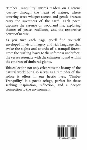 "Timber Tranquility" invites readers on a serene journey through the heart of nature, where towering trees whisper secrets and gentle breezes carry the sweetness of the earth. Each poem captures the essence of woodland life, exploring themes of peace, resilience, and the restorative power of nature. As you turn each page, you'll find yourself enveloped in vivid imagery and rich language that evoke the sights and sounds of a tranquil forest. From the rustling leaves to the soft moss underfoot, the verses resonate with the calmness found within the embrace of timbered giants. This collection not only celebrates the beauty of the natural world but also serves as a reminder of the solace it offers in our hectic lives. "Timber Tranquility" is a poetic refuge, perfect for those seeking inspiration, reflection, and a deeper connection to the environment.