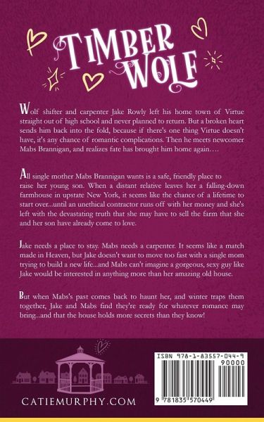 Wolf shifter and carpenter Jake Rowly left his home town of Virtue straight out of high school and never planned to return. But a broken heart sends him back into the fold, because if there's one thing Virtue doesn't have, it's any chance of romantic complications. Then he meets newcomer Mabs Brannigan, and realizes fate has brought him home again.... All single mother Mabs Brannigan wants is a safe, friendly place to raise her young son. When a distant relative leaves her a falling-down farmhouse in upstate New York, it seems like the chance of a lifetime to start over...until an unethical contractor runs off with her money and she's left with the devastating truth that she may have to sell the farm that she and her son have already come to love. Jake needs a place to stay. Mabs needs a carpenter. It seems like a match made in Heaven, but Jake doesn't want to move too fast with a single mom trying to build a new life...and Mabs can't imagine a gorgeous, sexy guy like Jake would be interested in anything more than her amazing old house. But when Mabs's past comes back to haunt her, and winter traps them together, Jake and Mabs find they're ready for whatever romance may bring...and that the house holds more secrets than they know!