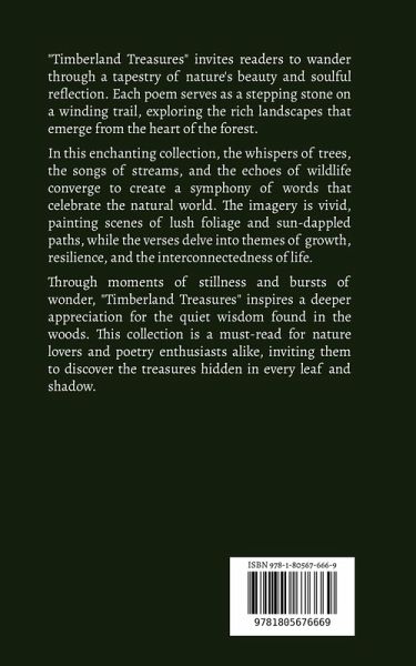 "Timberland Treasures" invites readers to wander through a tapestry of nature's beauty and soulful reflection. Each poem serves as a stepping stone on a winding trail, exploring the rich landscapes that emerge from the heart of the forest. In this enchanting collection, the whispers of trees, the songs of streams, and the echoes of wildlife converge to create a symphony of words that celebrate the natural world. The imagery is vivid, painting scenes of lush foliage and sun-dappled paths, while the verses delve into themes of growth, resilience, and the interconnectedness of life. Through moments of stillness and bursts of wonder, "Timberland Treasures" inspires a deeper appreciation for the quiet wisdom found in the woods. This collection is a must-read for nature lovers and poetry enthusiasts alike, inviting them to discover the treasures hidden in every leaf and shadow.