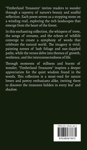 "Timberland Treasures" invites readers to wander through a tapestry of nature's beauty and soulful reflection. Each poem serves as a stepping stone on a winding trail, exploring the rich landscapes that emerge from the heart of the forest. In this enchanting collection, the whispers of trees, the songs of streams, and the echoes of wildlife converge to create a symphony of words that celebrate the natural world. The imagery is vivid, painting scenes of lush foliage and sun-dappled paths, while the verses delve into themes of growth, resilience, and the interconnectedness of life. Through moments of stillness and bursts of wonder, "Timberland Treasures" inspires a deeper appreciation for the quiet wisdom found in the woods. This collection is a must-read for nature lovers and poetry enthusiasts alike, inviting them to discover the treasures hidden in every leaf and shadow.