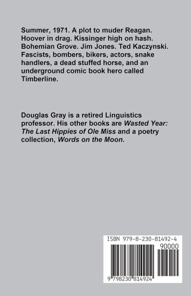 A modern Huck Finn hits the road when a young actor stumbles into a fascist plot against America in the age of Nixon. A plot to murder Ronald Reagan. Hoover in drag. Kissinger high on hash. Jim Jones. Ted Kaczynski. Fascists, bikers, bombers, snake handlers, a stuffed dead horse, and an underground comic book hero called Timberline. The mess we're in now started way back then.