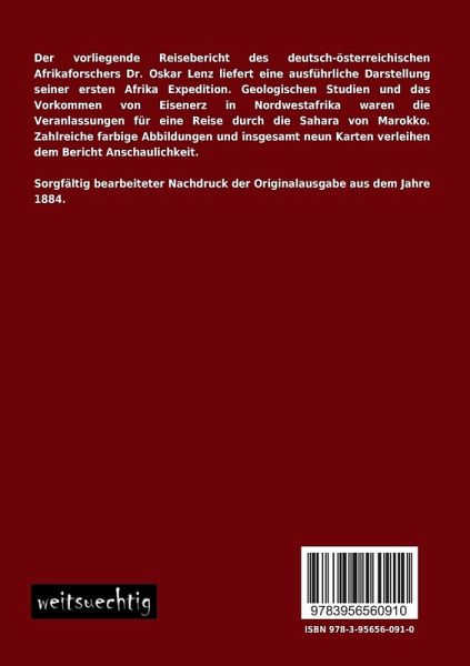 Der vorliegende Reisebericht des deutsch-österreichischen Afrikaforschers Dr. Oskar Lenz liefert eine ausführliche Darstellung seiner ersten Afrika Expedition. Geologischen Studien und das Vorkommen von Eisenerz in Nordwestafrika waren die Veranlassungen für eine Reise durch die Sahara von Marokko. Zahlreiche farbige Abbildungen und insgesamt neun Karten verleihen dem Bericht Anschaulichkeit.