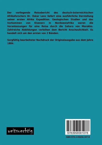 Der vorliegende Reisebericht des deutsch-österreichischen Afrikaforschers Dr. Oskar Lenz liefert eine ausführliche Darstellung seiner ersten Afrika Expedition. Geologischen Studien und das Vorkommen von Eisenerz in Nordwestafrika waren die Veranlassungen für eine Reise durch die Sahara von Marokko. Zahlreiche Abbildungen verleihen dem Bericht Anschaulichkeit. Es handelt sich um den ersten von 2 Bänden.