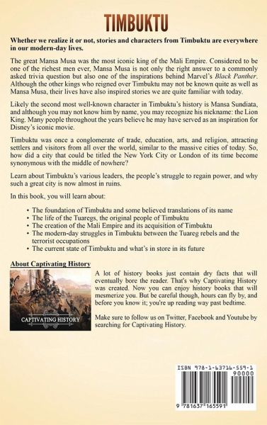 Whether we realize it or not, stories and characters from Timbuktu are everywhere in our modern-day lives. The great Mansa Musa was the most iconic king of the Mali Empire. Considered to be one of the richest men ever, Mansa Musa is not only the right answer to a commonly asked trivia question but also one of the inspirations behind Marvel's Black Panther. Although the other kings who reigned over Timbuktu may not be known quite as well as Mansa Musa, their lives have also inspired stories we are quite familiar with today. Likely the second most well-known character in Timbuktu's history is Mansa Sundiata, and although you may not know him by name, you may recognize his nickname: the Lion King. Many people throughout the years believe he may have served as an inspiration for Disney's iconic movie. Timbuktu was once a conglomerate of trade, education, arts, and religion, attracting settlers and visitors from all over the world, similar to the massive cities of today. So, how did a city that could be titled the New York City or London of its time become synonymous with the middle of nowhere? Learn about Timbuktu's various leaders, the people's struggle to regain power, and why such a great city is now almost in ruins. In this book, you will learn about:The foundation of Timbuktu and some believed translations of its name The life of the Tuaregs, the original people of Timbuktu The creation of the Mali Empire and its acquisition of Timbuktu The various mansas of the Mali Empire, including the great Mansa Musa The collapse of the Mali Empire The creation and early stages of the Songhai Empire The various kings of the Songhai Empire who transformed Timbuktu The collapse of the Songhai Empire and Morocco's occupation in Timbuktu The early Tuareg rebellions and the transfer of power in Timbuktu between the various groups still inhabiting the city during the Moroccan occupation The French acquisition of Morocco and Timbuktu French Sudan's (modern-day Mali's) road to independence The creation of the Republic of Mali The modern-day struggles in Timbuktu between the Tuareg rebels and the terrorist occupations The current state of Timbuktu and what's in store in its future Scroll up and click the "add to cart" button to learn all that and more about Timbuktu!