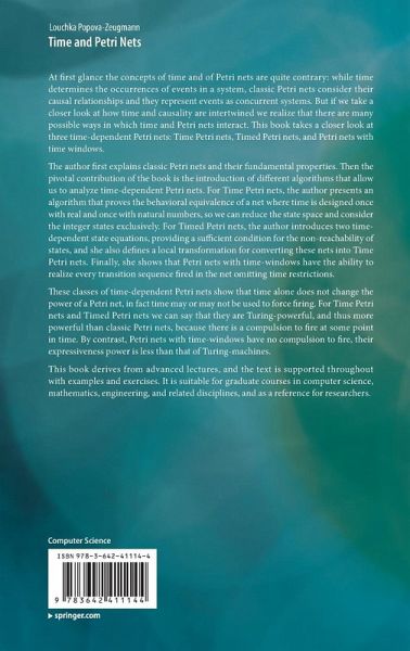 The author first explains classic Petri nets and their fundamental properties. Then the pivotal contribution of the book is the introduction of different algorithms that allow us to analyze time-dependent Petri nets. For Time Petri nets, the author presents an algorithm that proves the behavioral equivalence of a net where time is designed once with real and once with natural numbers, so we can reduce the state space and consider the integer states exclusively. For Timed Petri nets, the author introduces two time-dependent state equations, providing a sufficient condition for the non-reachability of states, and she also defines a local transformation for converting these nets into Time Petri nets. Finally, she shows that Petri nets with time-windows have the ability to realize every transition sequence fired in the net omitting time restrictions.