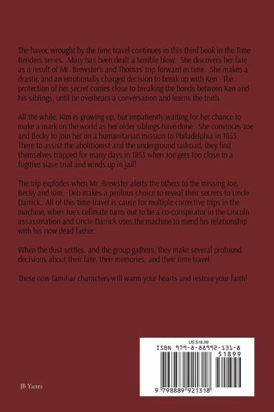 The havoc wrought by the time travel of the Fitzgerald siblings and their friends continues in the third book in the Time Benders series. Mary has been dealt a terrible blow. She discovers her fate as a result of Mr. Brewster and Thomas' trip forward in time. She makes a drastic and emotionally charged decision to break with Ken. The protection of her secret comes close to breaking the bonds between Ken and his siblings, until he overhears a conversation and learns the truth. All the while, Kim is growing up, and impatiently waiting for her chance to make a mark on the world as her older siblings have done. she convinces Joe and Becky to join her on a humanitarian mission to Philadelphia in 1853. There to assist the abolitionists and the underground railroad, they find themselves trapped for many days in 1853 when Joe gets too close to a fugitive salve trial and winds up in jail! The trip explodes when Mr. Brewster alerts the others to the missing Joe, Becky and Kim. Deb makes a perilous choice to reveal their secrets to Uncle Darrick. All of this time travel is cause for multiple corrective trips in the machine, when Joe's cell mate turns out to be a co-conspirator in the Lincoln assassination and Uncle Darrick uses the machine to mend his relationship with his now dead father. Ken and Ryan travel back to keep Joe from conversations with his cellmate that dramatically alter the course of history and Mr. Brewster must travel to stop Uncle Darrick from ruining his relationship with Alicia. When the dust settles, and the group gathers, they make several profound decisions about their fate, their memories, and their time travel and discover they have travelled a long way home, and learned much on that long road home. These now familiar characters will warm your hearts and restore your faith!