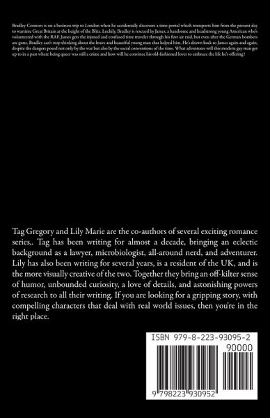 Bradley Connors is on a business trip to London when he accidentally discovers a time portal which transports him from the present day to wartime Great Britain at the height of the Blitz. Luckily, Bradley is rescued by James, a handsome and headstrong young American who's volunteered with the RAF. James gets the injured and confused time traveler through his first air raid, but even after the German bombers are gone, Bradley can't stop thinking about the brave and beautiful young man that helped him. He's drawn back to James again and again, despite the dangers posed not only by the war but also by the social conventions of the time. What adventures will this modern gay man get up to in a past where being queer was still a crime and how will he convince his old-fashioned lover to embrace the life he's offering?