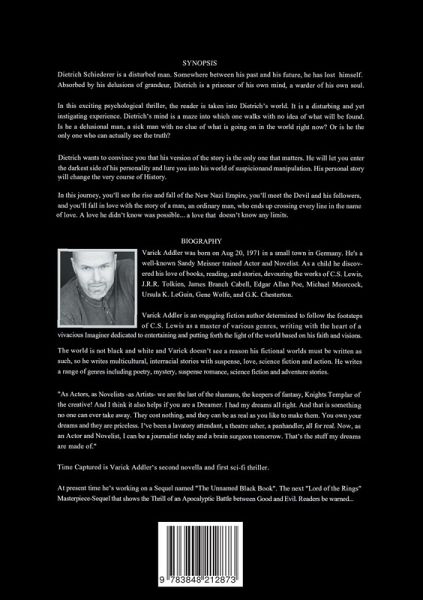 Varick Addler was born on Aug 20, 1971 in a small town in Germany. He's a well-known Sandy Meisner trained Actor and Novelist. As a child he discovered his love of books, reading, and stories, devouring the works of C.S. Lewis, J.R.R. Tolkien, James Branch Cabell, Edgar Allan Poe, Michael Moorcock, Ursula K. LeGuin, Gene Wolfe, and G.K. Chesterton. Varick Addler is an engaging fiction author determined to follow the footsteps of C.S. Lewis as a master of various genres, writing with the heart of a vivacious Imaginer dedicated to entertaining and putting forth the light of the world based on his faith and visions. The world is not black and white and Varick doesn't see a reason his fictional worlds must be written as such, so he writes multicultural, interracial stories with suspense, love, science fiction and action. He writes a range of genres including poetry, mystery, suspense romance, science fiction and adventure stories. "As Actors, as Novelists -as Artists- we are the last of the shamans, the keepers of fantasy, Knights Templar of the creative! And I think it also helps if you are a Dreamer. I had my dreams all right. And that is something no one can ever take away. They cost nothing, and they can be as real as you like to make them. You own your dreams and they are priceless. I've been a lavatory attendant, a theatre usher, a panhandler, all for real. Now, as an Actor and Novelist, I can be a journalist today and a brain surgeon tomorrow. That's the stuff my dreams are made of." Time Captured is Varick Addler's second novella and first sci-fi thriller. At present time he's working on a Sequel named "Faith and Fantasy". The next action thriller of biblical fiction that shows the thrill of an apocalyptic battle between Good and Evil. Readers be warned ...