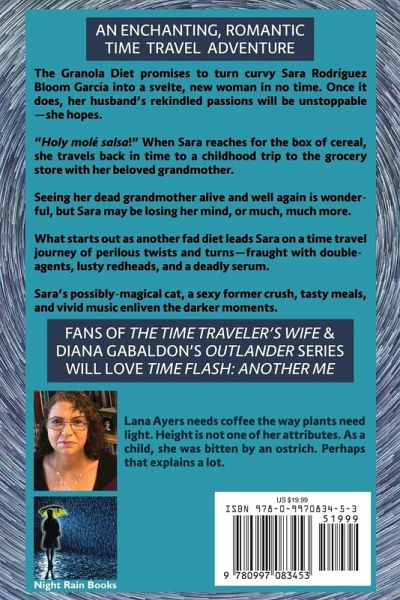 An Enchanting, Romantic Time Travel Adventure The Granola Diet promises to turn curvy Sara Rodríguez Bloom García into a svelte, new woman in no time. Once it does, her husband's rekindled passions will be unstoppable-she hopes. "Holy molé salsa!" When Sara reaches for the box of granola, she travels back in time to a childhood trip to the grocery store with her beloved grandmother. Seeing her dead grandmother alive and well again is wonderful, but Sara may be losing her mind, or much, much more. What starts out as another fad diet, leads Sara on a time travel journey of perilous twists and turns-fraught with double-agents, lusty redheads, and a deadly serum. Sara's possibly-magical cat, a sexy former crush, tasty meals, and vivid music enliven the darker moments. Fans of The Time Traveler's Wife and Diana Gabaldon's Outlander series will love Time Flash: Another Me.