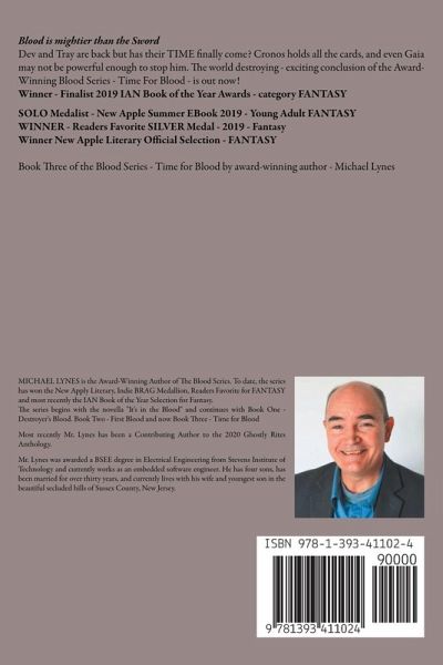 Blood is mightier than the Sword Dev and Tray are back but has their TIME finally come? Cronos holds all the cards, and even Gaia may not be powerful enough to stop him. The world destroying - exciting conclusion of the Award-Winning Blood Series - Time For Blood - is out now! Winner - Finalist 2019 IAN Book of the Year Awards - category FANTASY SOLO Medalist - New Apple Summer EBook 2019 - Young Adult FANTASY WINNER - Readers Favorite SILVER Medal - 2019 - Fantasy Winner New Apple Literary Official Selection - FANTASY Book Three of the Blood Series - Time for Blood by award-winning author - Michael Lynes