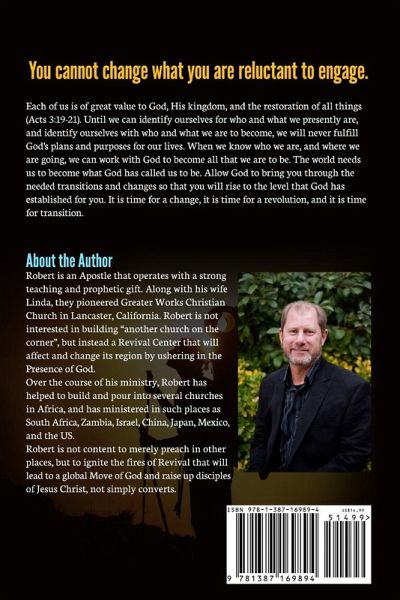 You cannot change what you are reluctant to engage. Each of us is of great value to God, His kingdom, and the restoration of all things (Acts 3:19-21). Until we can identify ourselves for who and what we presently are, and identify ourselves with who and what we are to become, we will never fulfill God's plans and purposes for our lives. When we know who we are, and where we are going, we can work with God to become all that we are to be. The world needs us to become what God has called us to be. Allow God to bring you through the needed transitions and changes so that you will rise to the level that God has established for you. It is time for a change, it is time for a revolution, and it is time for transition.