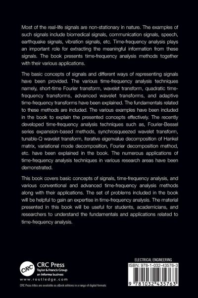 1. Basics of signals. 2. Signal representation. 3. Basics of time frequency analysis. 4. Short time Fourier transform. 5 Wavelet transform. 6 Quadratic time frequency transforms. 7 Advanced wavelet transforms. 8 Adaptive time frequency transforms. 9 Applications