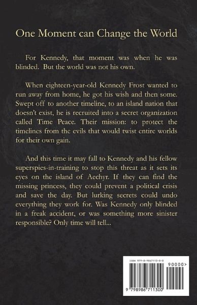 One moment can change the world. With the heir to the throne missing and a revolution simmering just below the surface, that moment draws near for the island nation of Aechyr. And eighteen-year-old Kennedy Frost may be the only one to save it. Kennedy was just a runaway when he was recruited by Time Peace. Their mission: stop the evil conspiracy called Anarakia from dominating the timelines. And just as he sets foot on Aechyr, Anarakia sets their sights on it. Now Kennedy eagerly thrusts himself into his first mission while still trying to survive his superspy training. Because Kennedy and his fellow trainees may not be the only ones undercover at the prestigious Aechyr Academy. Hiding in plain sight at the college may be none other than the princess who renounced the crown years before. If Kennedy can find her, she could bring stability back to the nation. Or it could all be useless against the grand machinations of Anarakia. Kennedy will have to learn the game fast, or it'll all be lost. The moment he chooses between playing by the rules and being a hero will change more than one world.