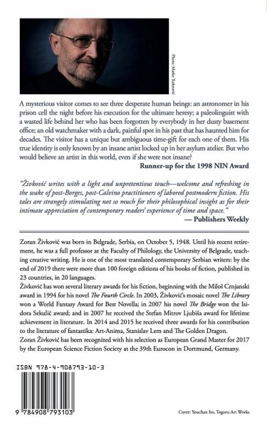 A mysterious visitor comes to see three desperate human beings: an astronomer in his prison cell the night before his execution for the ultimate heresy; a paleolinguist with a wasted life behind her who has been forgotten by everybody in her dusty basement office; an old watchmaker with a dark, painful spot in his past that has haunted him for decades. The visitor has a unique but ambiguous time-gift for each one of them. His true identity is only known by an insane artist locked up in her asylum atelier. But who would believe an artist in this world, even if she were not insane? Runner-up for the 1998 NIN Award, by a World Fantasy Award-winning author