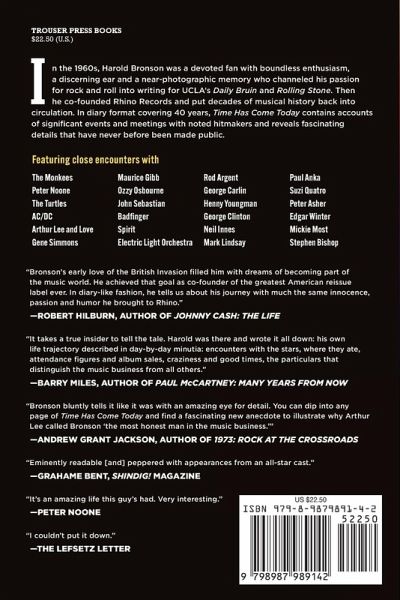People who are born into a life of rock and roll either make music, collect it, write about it, sell it or get into the record business. Harold Bronson has done all of those things. In Time Has Come Today, he recounts the fascinating adventure of his musical life. Before he co-founded Rhino Records, America's leading reissue label, and put decades of music history back into circulation, Bronson was just another devoted fan growing up in Southern California in the 1960s. But with boundless enthusiasm, a discerning ear and a near-photographic memory, he channeled his passion into writing for the UCLA Daily Bruin and then Rolling Stone. He met and interviewed many of the era's greats, then launched the Rhino label from the back room of the Los Angeles record store he managed. In that role, he worked behind the scenes with many of those same artists - in studios, offices, concert halls and restaurants - to bring their old (sometimes new) music to the public. Time Has Come Today contains concert accounts, historical events and meetings with noted hitmakers, with fascinating details that have never before been made public. This unique, behind-the-scenes document is packed with dates and details and loaded with many of the great Bronson worked with: Lunches with Peter Noone, Terri Nunn, Wally Amos, Henny Youngman, Andrew Loog Oldham A limo ride with all four Monkees In the studio with Black Sabbath and others Home visits with George Carlin, Howard Kaylan of the Turtles, Mike Nesmith, Stephen Bishop and more Parties with Gene Simmons, Alice Cooper and more Conversations with the Bee Gees, the Doors, the Knack, ELO, George Clinton, Mickie Most, Hunter S. Thompson, John Sebastian, Van Dyke Parks, Rod Argent, Bon Scott, Janis Ian, Edgar Winter, the Chambers Brothers, Suzi Quatro, David Essex, Sha Na Na, Mike Chapman, Nicky Hopkins, Badfinger, John Kay of Steppenwolf and many more