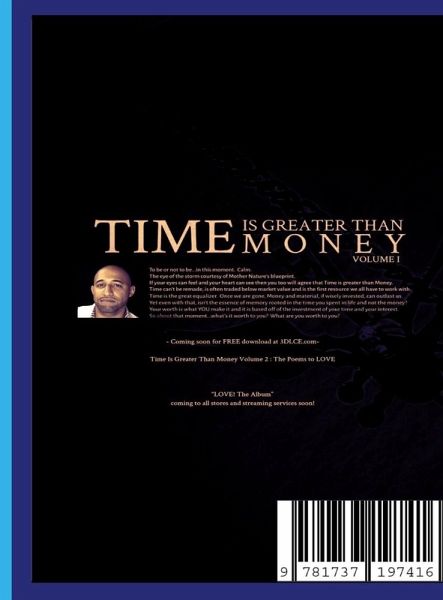 What is your time worth? What is your life's worth? Time is not money. We have been lied to. Time is the theorized 4th dimension of existence while money is simply the accepted trade value of it. So what's it worth to you? Time Is Greater Than Money, Volume 1 was written to inspire humankind to ask these questions and holistically enhance our human development with true senses of Freedom and Liberty and, to empower you to seek your answers, more efficiently direct your time and manifest the destined life that awaits your acceptance of the challenge of LIFE. They say Time is Money...is it?