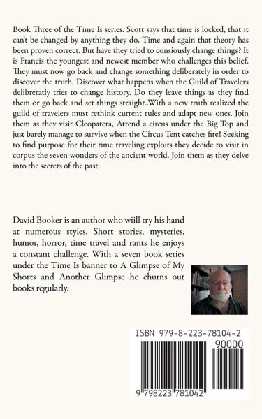 Book Three of the Time Is series. Scott says that time is locked, that it can't be changed by anything they do. Time and again that theory has been proven correct. But have they tried to consiously change things? It is Francis the youngest and newest member who challenges this belief. They must now go back and change something deliberately in order to discover the truth. Discover what happens when the Guild of Travelers delibreratly tries to change history. Do they leave things as they find them or go back and set things straight..With a new truth realized the guild of travelers must rethink current rules and adapt new ones. Join them as they visit Cleopatera, Attend a circus under the Big Top and just barely manage to survive when the Circus Tent catches fire! Seeking to find purpose for their time traveling exploits they decide to visit in corpus the seven wonders of the ancient world. Join them as they delve into the secrets of the past.