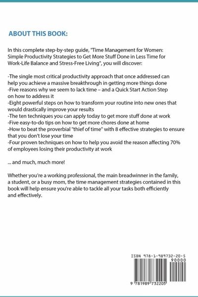 If you feel like there's not enough time to do all the tasks and chores and would like to discover how to control more of your time for increased productivity and less effort, keep reading… Did you know: According to Hive.com, even though women finish more work, they are given 55% more tasks than men An article on Forbes.com states that forty-nine percent of employed women in the U.S., including 42% of working moms, who report that they are their family's primary breadwinner, leaving them with more responsibilities to face on a daily basis Research shows that while a third of employees experience chronic stress, women address increased levels of work stress than men Everyone gets the same amount of time in a day, yet it can feel harder for you to manage your time than most people. This difficulty is not an uncommon occurrence; many women feel this daily. From waking up and rushing to work and then coming home to clean up around the house and cook for your family, you likely have a lot on your plate. When you don't know how to manage your time, fitting all of these tasks in a day seems impossible and stressful. If you can identify with this sentiment, you are likely a woman with too much to do and not enough resources to make it happen. When it comes to time, there is no way to make more of it. What must happen is a complete prioritization of all the tasks that you must accomplish each day. By changing the way you view your schedule, you will realize that the time you have can work for you. Once you can do this, the problems that once held you back will merely be steps to take toward living your most productive life. In this complete step-by-step guide, "Time Management for Women: Simple Productivity Strategies to Get More Stuff Done in Less Time for Work-Life Balance and Stress-Free Living", you will discover: The single most critical productivity approach that once addressed can help you achieve a massive breakthrough in getting more things done Five reasons why we seem to lack time - and a Quick Start Action Step on how to address it Eight powerful steps on how to transform your routine into new ones that would drastically improve your results The ten techniques you can apply today to get more stuff done at work Five easy-to-do tips on how to get more chores done at home How to beat the proverbial "thief of time" with 8 effective strategies to ensure that you don't lose your time Four proven techniques on how to help you avoid the reason affecting 70% of employees losing their productivity at work ...and much, much more! Added BONUSES: Bonus 1: Includes a Bonus Chapter on how to schedule your time with the important people in your life for less stress and more fun Bonus 2: Quick Start Action Steps at the end of chapters, each designed to provide you with results in less time Whether you're a working professional, the main breadwinner in the family, a student, or a busy mom, the time management strategies contained in this book will help ensure you're able to tackle all your tasks both efficiently and effectively. If you are ready to discover how to control more of your time for increased productivity and less effort at home, at work or in school, scroll up and click the "Buy Now" button to get started today.