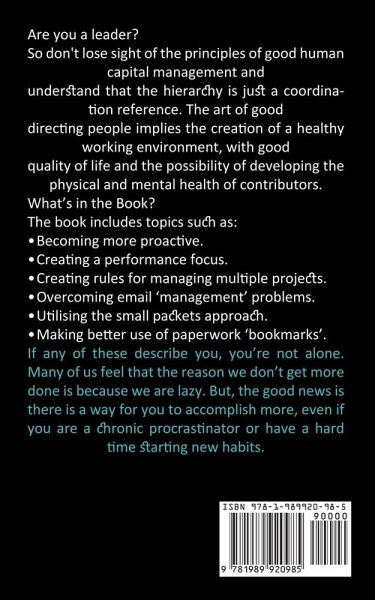 Are you a leader? So don't lose sight of the principles of good human capital management and understand that the hierarchy is just a coordination reference. The art of good directing people implies the creation of a healthy working environment, with good quality of life and the possibility of developing the physical and mental health of contributors. What's in the Book? The book includes topics such as: Becoming more proactive.Creating a performance focus.Creating rules for managing multiple projects.Overcoming email 'management' problems.Utilising the small packets approach.Making better use of paperwork 'bookmarks'. If any of these describe you, you're not alone. Many of us feel that the reason we don't get more done is because we are lazy. But, the good news is there is a way for you to accomplish more, even if you are a chronic procrastinator or have a hard time starting new habits.