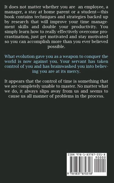 It does not matter whether you are an employee, a manager, a stay at home parent or a student this book contains techniques and strategies backed up by research that will improve your time management skills and double your productivity. You simply learn how to really effectively overcome procrastination, just get motivated and stay motivated so you can accomplish more than you ever believed possible. What evolution gave you as a weapon to conquer the world is now against you. Your servant has taken control of you and has brainwashed you into believing you are at its mercy. It appears that the control of time is something that we are completely unable to master. No matter what we do, it always slips away from us and seems to cause us all manner of problems in the process.