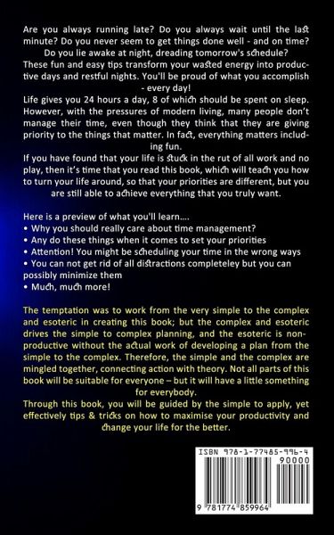 Are you always running late? Do you always wait until the last minute? Do you never seem to get things done well - and on time? Do you lie awake at night, dreading tomorrow's schedule? These fun and easy tips transform your wasted energy into productive days and restful nights. You'll be proud of what you accomplish - every day! Life gives you 24 hours a day, 8 of which should be spent on sleep. However, with the pressures of modern living, many people don't manage their time, even though they think that they are giving priority to the things that matter. In fact, everything matters including fun. If you have found that your life is stuck in the rut of all work and no play, then it's time that you read this book, which will teach you how to turn your life around, so that your priorities are different, but you are still able to achieve everything that you truly want. Here Is A Preview Of What You'll Learn....Why You Should Really Care about Time Management? Any Do These Things When It Comes To Set Your Priorities Attention! You Might Be Scheduling Your Time In The Wrong Ways You can not get rid of all distractions completeley but you can Possibly minimize them Much, much more! The temptation was to work from the very simple to the complex and esoteric in creating this book; but the complex and esoteric drives the simple to complex planning, and the esoteric is non-productive without the actual work of developing a plan from the simple to the complex. Therefore, the simple and the complex are mingled together, connecting action with theory. Not all parts of this book will be suitable for everyone - but it will have a little something for everybody. Through this book, you will be guided by the simple to apply, yet effectively tips & tricks on how to maximise your productivity and change your life for the better.
