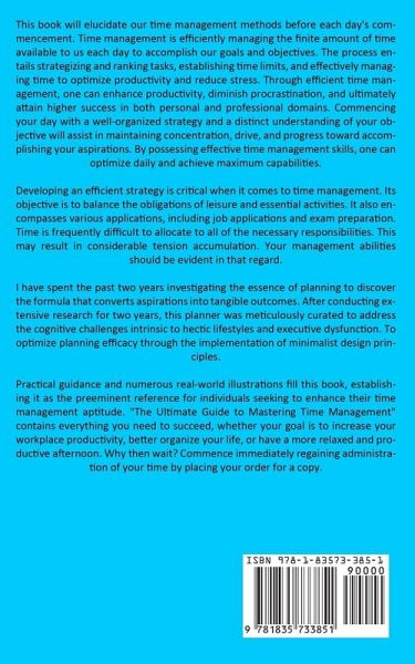 This book will elucidate our time management methods before each day's commencement. Time management is efficiently managing the finite amount of time available to us each day to accomplish our goals and objectives. The process entails strategizing and ranking tasks, establishing time limits, and effectively managing time to optimize productivity and reduce stress. Through efficient time management, one can enhance productivity, diminish procrastination, and ultimately attain higher success in both personal and professional domains. Commencing your day with a well-organized strategy and a distinct understanding of your objective will assist in maintaining concentration, drive, and progress toward accomplishing your aspirations. By possessing effective time management skills, one can optimize daily and achieve maximum capabilities. Developing an efficient strategy is critical when it comes to time management. Its objective is to balance the obligations of leisure and essential activities. It also encompasses various applications, including job applications and exam preparation. Time is frequently difficult to allocate to all of the necessary responsibilities. This may result in considerable tension accumulation. Your management abilities should be evident in that regard. I have spent the past two years investigating the essence of planning to discover the formula that converts aspirations into tangible outcomes. After conducting extensive research for two years, this planner was meticulously curated to address the cognitive challenges intrinsic to hectic lifestyles and executive dysfunction. To optimize planning efficacy through the implementation of minimalist design principles. Practical guidance and numerous real-world illustrations fill this book, establishing it as the preeminent reference for individuals seeking to enhance their time management aptitude. "The Ultimate Guide to Mastering Time Management" contains everything you need to succeed, whether your goal is to increase your workplace productivity, better organize your life, or have a more relaxed and productive afternoon. Why then wait? Commence immediately regaining administration of your time by placing your order for a copy.