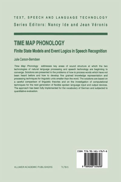 This book is a revised version of my doctoral thesis which was submitted in April 1993. The main extension is a chapter on evaluation of the system de scribed in Chapter 8 as this is clearly an issue which was not treated in the original version. This required the collection of data, the development of a concept for diagnostic evaluation of linguistic word recognition systems and, of course, the actual evaluation of the system itself. The revisions made primarily concern the presentation of the latest version of the SILPA system described in an additional Subsection 8. 3, the development environment for SILPA in Sec tion 8. 4, the diagnostic evaluation of the system as an additional Chapter 9. Some updates are included in the discussion of phonology and computation in Chapter 2 and finite state techniques in computational phonology in Chapter 3. The thesis was designed primarily as a contribution to the area of compu tational phonology. However, it addresses issues which are relevant within the disciplines of general linguistics, computational linguistics and, in particular, speech technology, in providing a detailed declarative, computationally inter preted linguistic model for application in spoken language processing. Time Map Phonology is a novel, constraint-based approach based on a two-stage temporal interpretation of phonological categories as events.