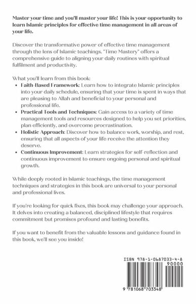 Master your time and you'll master your life! This is your opportunity to learn Islamic principles for effective time management in all areas of your life. Discover the transformative power of effective time management through the lens of Islamic teachings. "Time Mastery" offers a comprehensive guide to aligning your daily routines with spiritual fulfilment and productivity. What you'll learn from this book:Faith-Based Framework: Learn how to integrate Islamic principles into your daily schedule, ensuring that your time is spent in ways that are pleasing to Allah and beneficial to your personal and professional life. Practical Tools and Techniques: Gain access to a variety of time management tools and resources designed to help you set priorities, plan efficiently, and overcome procrastination. Holistic Approach: Discover how to balance work, worship, and rest, ensuring that all aspects of your life receive the attention they deserve. Continuous Improvement: Learn strategies for self-reflection and continuous improvement to ensure ongoing personal and spiritual growth. While deeply rooted in Islamic teachings, the time management techniques and strategies in this book are universal to your personal and professional lives. If you're looking for quick fixes, this book may challenge your approach. It delves into creating a balanced, disciplined lifestyle that requires commitment but promises profound and lasting benefits. If you want to benefit from the valuable lessons and guidance found in this book, we'll see you inside!