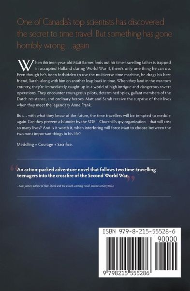 One of Canada's top scientists has discovered the secret to time travel. But something has gone horribly wrong . . . again. When thirteen-year-old Matt Barnes finds out his time-travelling father is trapped in occupied Holland during World War II, there's only one thing he can do. Even though he's been forbidden to use the multiverse time machine, he drags his best friend, Sarah, along with him on another leap back in time. When they land in the war-torn country, they're immediately caught up in a world of high intrigue and dangerous covert operations. They encounter courageous pilots, determined spies, gallant members of the Dutch resistance, and ordinary heroes. Matt and Sarah receive the surprise of their lives when they meet the legendary Anne Frank. But . . . with what they know of the future, the time travellers will be tempted to meddle again. Can they prevent a blunder by the SOE—Churchill's spy organization—that will cost so many lives? And is it worth it, when interfering will force Matt to choose between the two most important things in his life? Meddling = Courage + Sacrifice. "...this is an enthralling story that will have middle grade readers turning the page to find out what risky situations Matt and Sarah will place themselves in next. Information about the English spy network and the Dutch resistance add historical context to the story, and readers are even introduced to the famed diarist, Anne Frank." ¿Diana Mumford, Canadian Teacher Magazine