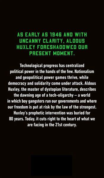As early as 1946 and with uncanny clarity, Aldous Huxley foreshadowed our present moment where technological progress has centralized political power in the hands of the few. In times of social upheaval, nationalism and geopolitical power games thrive, while democracy and solidarity come under attack. Aldous Huxley, the master of dystopian literature, describes the dawning age of a tech-oligarchy - a world in which boy gangsters run our governments and where our freedom is put at risk by the law of the strongest. Huxley's prophetic intervention was buried for 80 years. Today, it cuts right to the heart of what we are facing in the 21st century.