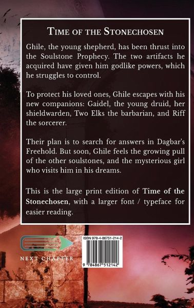 Ghile, the young shepherd, has been thrust into the Soulstone Prophecy. The two artifacts he acquired have given him godlike powers, which he struggles to control. To protect his loved ones, Ghile escapes with his new companions: Gaidel, the young druid, her shieldwarden, Two Elks the barbarian, and Riff the sorcerer. Their plan is to search for answers in Dagbar's Freehold. But soon, Ghile feels the growing pull of the other soulstones, and the mysterious girl who visits him in his dreams. This is the large print edition of Time of the Stonechosen, with a larger font / typeface for easier reading.