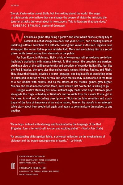 When does a game stop being a game? And what would cause a young boy to commit an act of savage violence? In Time on My Hands by Giorgio Vasta, the year is 1978, and a chilling drama is unfolding in Rome. Members of a leftist terrorist group known as the Red Brigades have kidnapped the former Italian prime minister, Aldo Moro, and are holding him in a secret prison, while broadcasting their demands to the public. Far from Rome, in Palermo, Sicily, a trio of eleven-year-old schoolboys are following Moro's abduction with intense interest. To their minds, the terrorists are warriors, striking a blow at the stifling conformity and propriety of everyday Italian life. Just like the Red Brigades, the boys give themselves code names: Nimbus, Radius, and Flight. They shave their heads, develop a secret language, and begin a life of escalating crime in worshipful imitation of their heroes. But when Moro's body is discovered in the trunk of a car, riddled with bullets, and as the stakes of the friends' games grow higher, Nimbus, the most innocent of the three, must decide just how far he is willing to go.