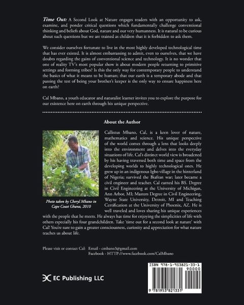 Time Out: A Second Look at Nature engages readers with an opportunity to ask, examine, and ponder critical questions which fundamentally challenge conventional thinking and beliefs about God, nature and our very humanness. It is natural to be curious about such questions but we are trained as children that it is forbidden to ask them. We consider ourselves fortunate to live in the most highly developed technological time that has ever existed. It is almost embarrassing to admit, even to ourselves, that we have doubts regarding the gains of conventional science and technology. It is no wonder that one of reality TV's most popular show is about modern people returning to primitive settings and forming tribes? Is this the only way for contemporary people to understand the basics of what it means to be human; that our earth is a temporary abode and that passing the test of being your brother's keeper is the only way to ensure happiness here on earth? Cal Mbano, a youth educator and naturalist learner invites you to explore the purpose for our existence here on earth through his unique perspective.