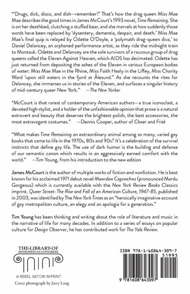"Well, it just sings." -Susan Sontag "'Drugs, dick, disco, and dish-remember?' That's how the drag queen Miss Mae Mae describes the good times in James McCourt's 1993 novel, Time Remaining. She is on her deathbed, clutching a stuffed bear, and she marvels at how suddenly those words have been replaced by 'dysentery, dementia, despair, and death.' Miss Mae Mae's final quip is relayed by Odette O'Doyle, a 'polymath drag-queen diva, ' to Daniel Delancey, an orphaned performance artist, as they ride the midnight train to Montauk. Odette and Delancey are the sole survivors of a raucous group of drag queens called the Eleven Against Heaven, which AIDS has decimated. Odette has just returned from depositing the ashes of the Eleven in various European bodies of water: Miss Mae Mae in the Rhine, Miss Faith Healy in the Liffey, Miss Charity Ward 'upon still waters in the fjord at Ålesund." As she recounts the rites for Delancey, she immerses us in stories of the Eleven, and surfaces a singular history of mid-century queer New York." - The New Yorker"McCourt is that rarest of contemporary American authors-a true iconoclast, a devoted high stylist, and a holder of the unfashionable opinion that prose is a natural extrovert and beauty that deserves the brightest polish, the best accessories, the most extravagant costumes." -Dennis Cooper, author of Closer and Frisk"What makes Time Remaining an extraordinary animal among so many, varied gay books that came to life in the 1970s, 80s and 90s? It's a celebration of the survival instincts that define gay life. The use of dark humor is the building and defense of our semantic canon which results in an aggressively earned comfort with the world." -Tim Young, from his introduction to the new edition James McCourt is the author of multiple works of fiction and nonfiction. He is best known for his acclaimed 1971 debut novel Mawrdew Czgowchwz (pronounced Mardu Gorgeous) which is currently available with the New York Review Books Classics imprint. Queer Street: The Rise and Fall of an American Culture, 1947-85, published in 2003, was identified by The New York Times as an "heroically imaginative account of gay metropolitan culture, an elegy and an apologia for a generation." Tim Young has been thinking and writing about the role of literature and music in the narrative of life for many decades. In addition to a series of essays on popular culture for Design Observer, he has contributed work for The Yale Review.