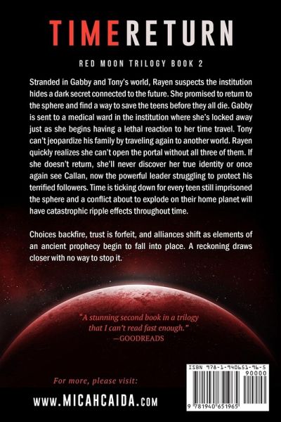In the second book of this high action science fiction trilogy by USA Today bestseller Micah Caida, two worlds grow closer to an apocalyptic end. Rayen, Gabby, and Tony face their own problems at the institute. Chaos erupts in the sphere. Time is everyone’s enemy. Stranded in Gabby and Tony's world, Rayen suspects the institute hides a dark secret connected to the future. She promised to return to the sphere and find a way to save the teens before they all die. Gabby is sent to a medical ward in the institution where she's locked away just as she begins having a lethal reaction to her time travel. Tony can't jeopardize his family by traveling again to another world. Rayen quickly realizes she can't open the portal without all three of them. If she doesn't return, she'll never discover her true identity or once again see Callan, now the powerful leader struggling to protect his terrified followers. Time is ticking down for every teen still imprisoned the sphere and a conflict about to explode on their home planet will have catastrophic ripple effects throughout time. Choices backfire, trust is forfeit, and alliances shift as elements of an ancient prophecy begin to fall into place. A reckoning draws closer with no way to stop it. "This is one of those series that gets people addicted to reading. Book #2 was just as magnificent as the first!" ~~ Heathercm, Goodreads